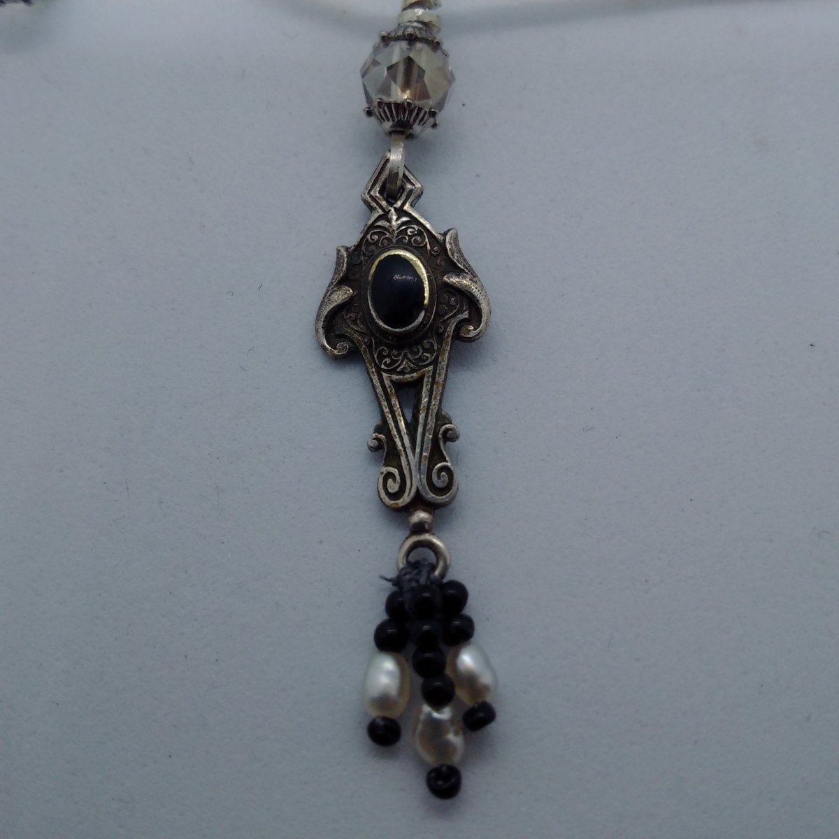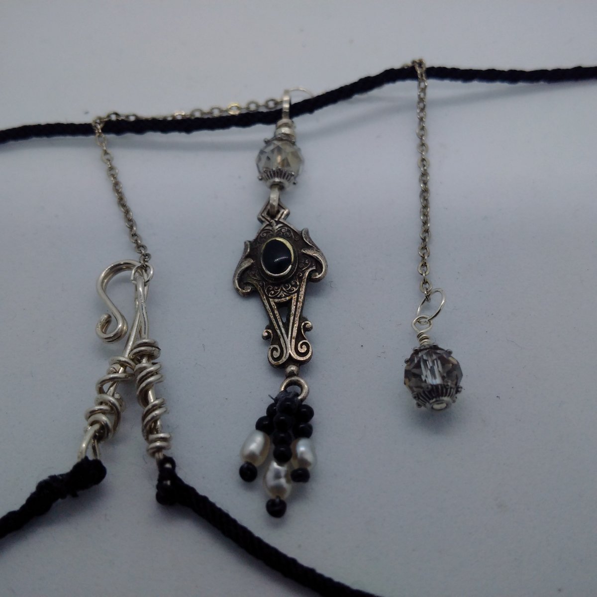 Old: Sterling and onyx earring, sterling silver chain, antique crystal beads.
